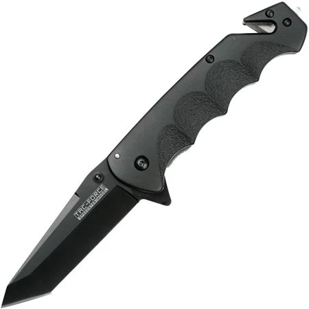 Model/Part Number – TF499BT. Tac Force Rescue Linerlock A/O. Assisted opening. 4.75″ (12.07cm) closed. 3.25″ (8.26cm) black finish stainless tanto blade. Black aluminum handle. Extended tang. Thumb stud. Belt/cord cutter. Glass breaker. Pocket clip. Boxed. Made in China.