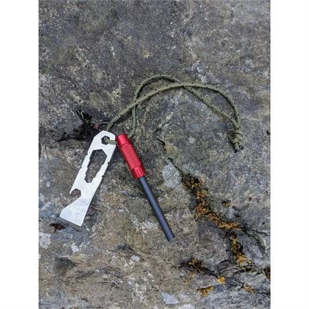 - Includes: 3000 strike ferro rod with red aluminum handle; Multi-tool stainless striker; Green lanyard cord