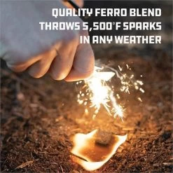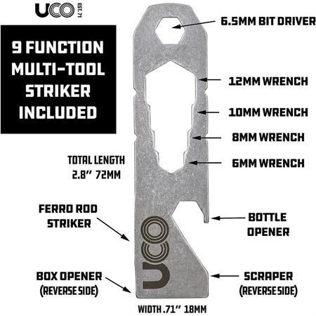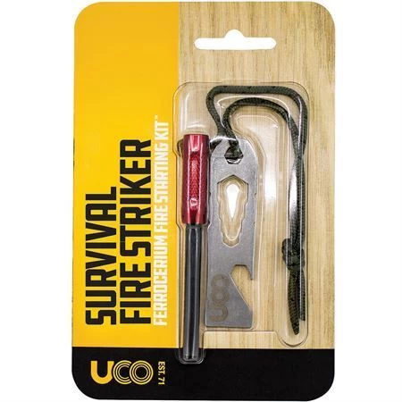 Model – UCO00337. Survival Fire Striker. 3.5 inch overall. Includes: 3000 strike ferro rod with red aluminum handle; Multi-tool stainless striker; Green lanyard cord. Hang packaged.