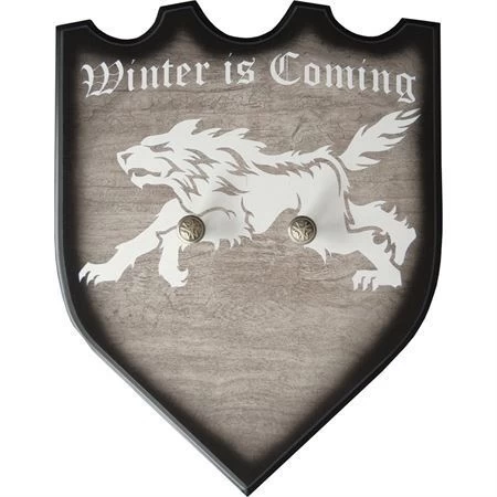 Model – VS0001. Valyrian Steel 0001 – Longclaw Sword of Jon Snow. 45″ (114.3cm) overall. 39″ (99.06cm) stainless blade. Cast metal handle with black leather wrapped grip and antique nickel plate. Powder coated metal wolf pommel with acrylic faux garnet eyes. Silkscreened wood plaque with Night’s Watch Oath. Officially licensed from George R. R. Martin’s A Song of Fire and Ice book series. Second edition. Boxed. Made in China.